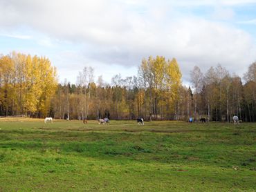 Alla hästarna går i samma stora hage som är härligt varierande med både skog